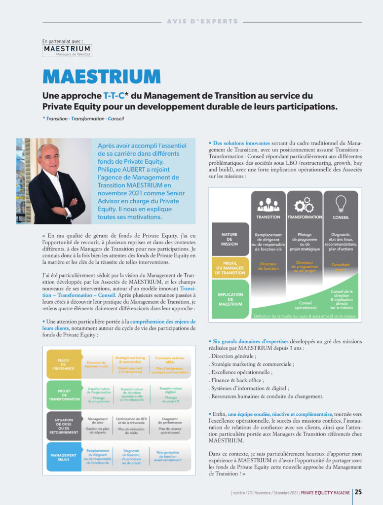 Philippe AUBERT, Sénior Advisor de MAESTRIUM, a répondu aux questions de Private Equity Magazine